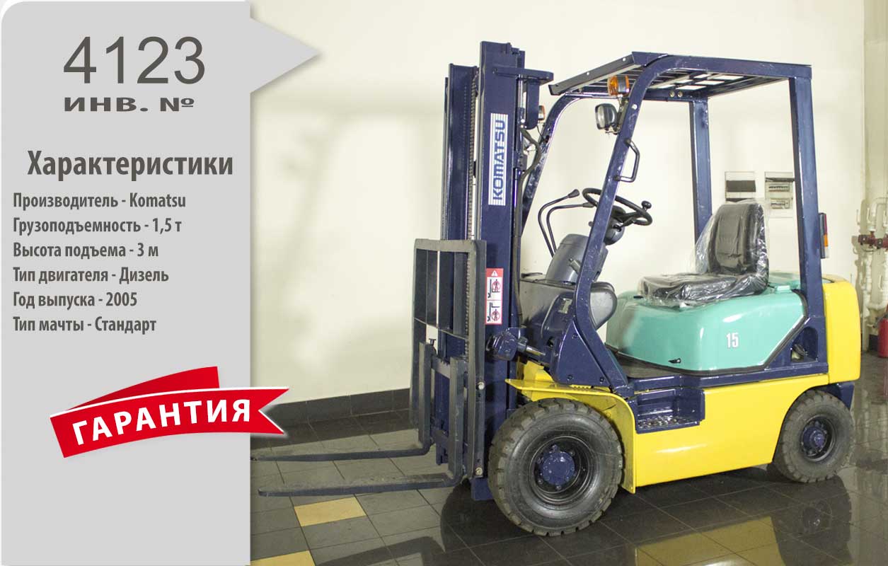 Дизельный автопогрузчик Komatsu Б/У с интентарным номером 4123 2005 года выпуска. Состояние - Хорошее. Имеет грузоподъемность 1500 кг. Гарантия: .